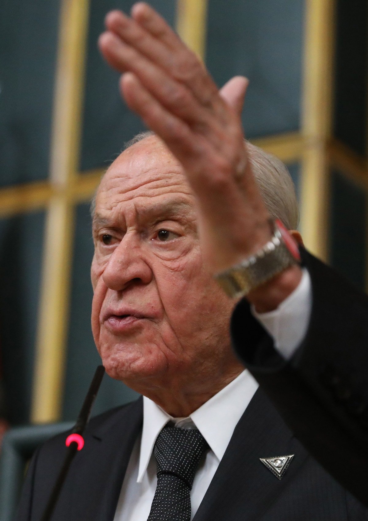 Bahçeli’nin dünkü grupta ceketine taktığı rozet ve parmağındaki yüzük dikkat çekti. Safir taşlarla süslü rozette Fettahoğulları mührünün yer aldı öğrenildi. Bahçeli, Fettahoğulları olarak bilinen geniş bir Türkmen sülalesine mensup. Yüzükte ise Allah’ın isimlerinden de olan “El-Fettah” ve “Ya-Şafi” yazısı bulunuyor.