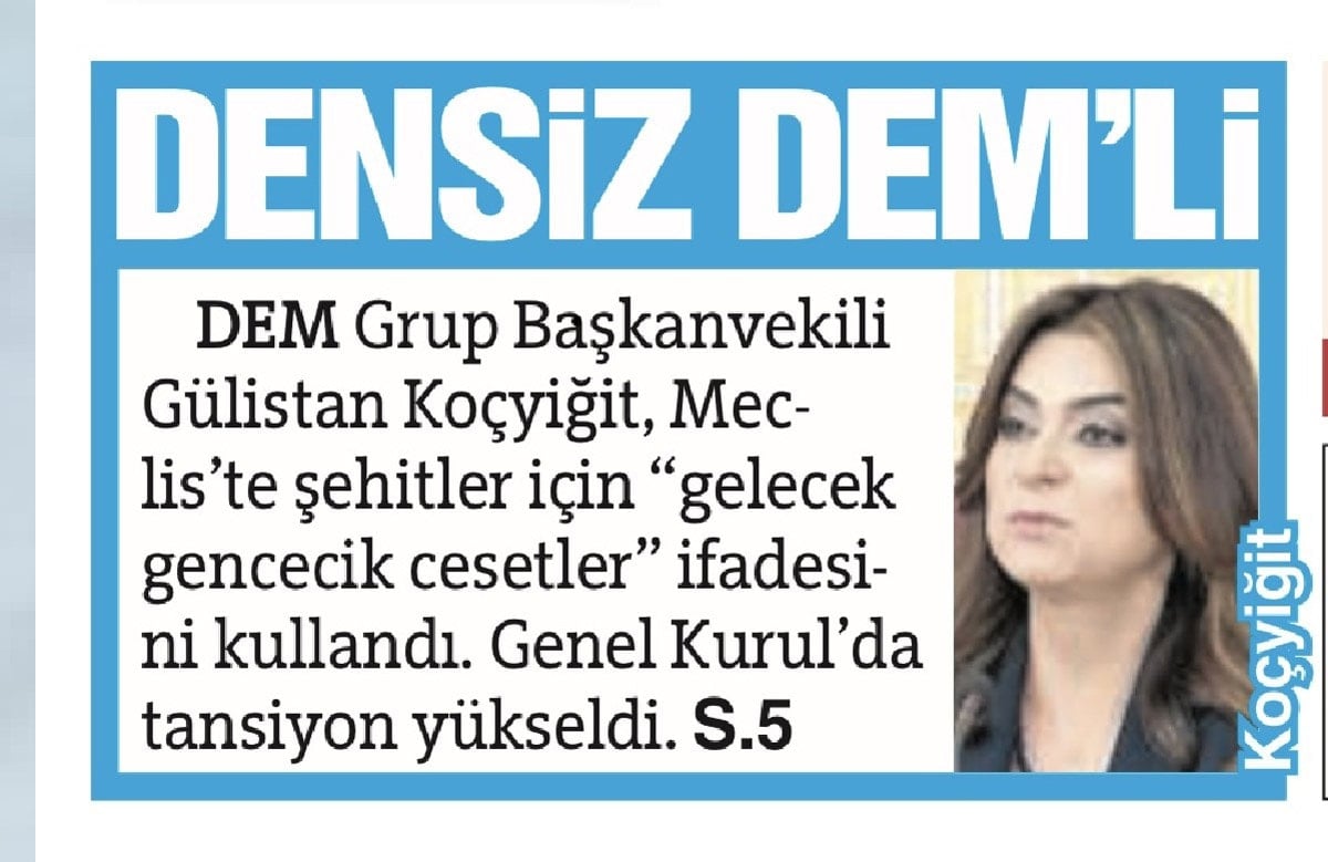 Bahçeli DEM’li Gülistan Koçyiğit’in şehitler için “gencecik cesetler” demesine de tepki gösterdi “Herkesi ve özellikle muhatapları sorumlu bir dil kullanmaya davet ediyorum. Şehitlerimize gencecik cesetler demek doğru değildir. Şehitler ceset değildir. Onlar bizim kahramanımız” dedi.