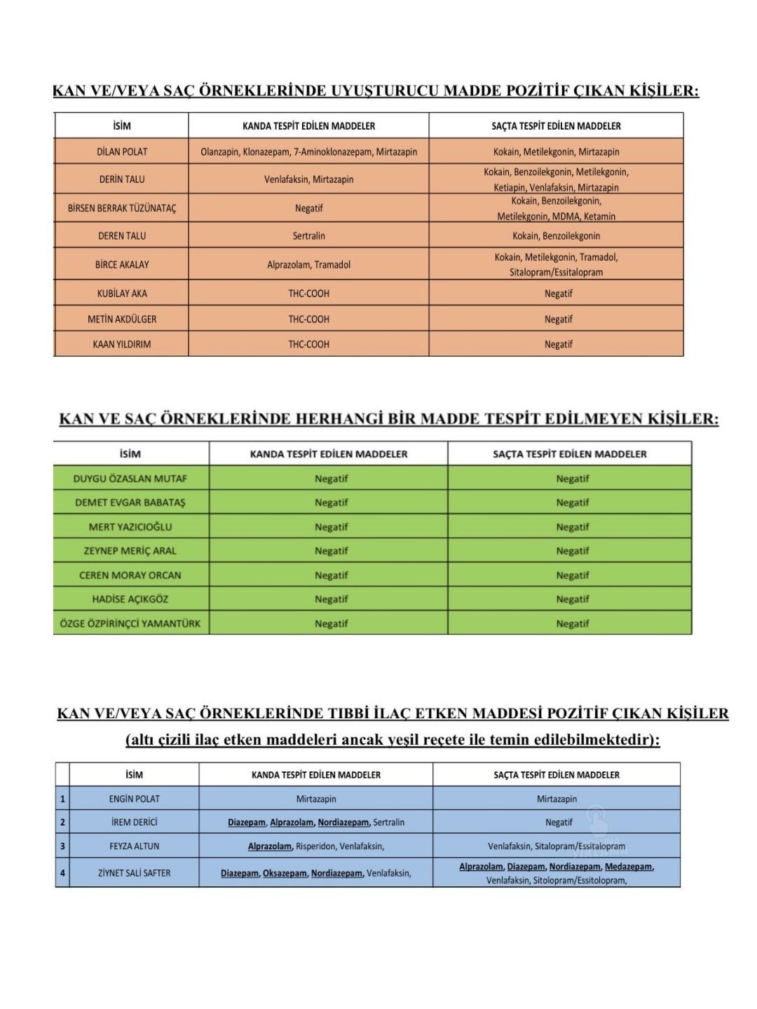 Kanında ilaç etken maddesi tespit edilen ünlüler ise Engin Polat, İrem Derici, Feyza Altun ve Ziynet Sali Safter olarak açıklandı.
